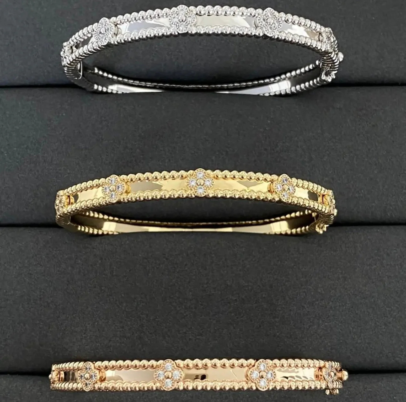 - Our High quality Cleef bracelet is full of diamonds, which is very bright when visible to the naked eye, and even brighter when exposed to light or sunlight.